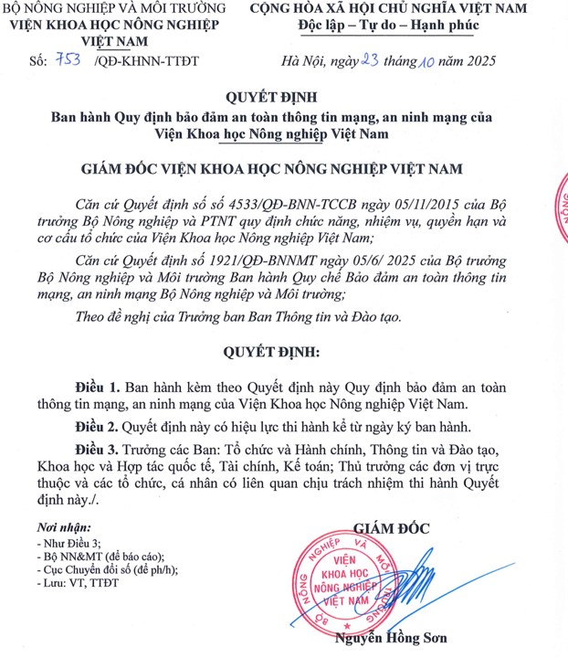 Đăng ngày:11/27/2025 4:36:24 PM bởi adminQuyết định số 753/QĐ-KHNN-TTĐT ban hành quy định đảm bảo an toàn thông tin mạng